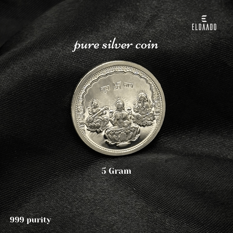 Embrace divine blessings with this 5 gram 999 purity silver coin featuring the sacred images of Goddess Lakshmi, Goddess Saraswati, and Lord Ganesha. Symbolizing wealth, wisdom, and success, this coin is a perfect choice for auspicious occasions, festivals, weddings, or as a timeless investment. Crafted with 99.9% pure silver, it carries not only monetary value but also deep spiritual significance, making it an ideal gift of prosperity and blessings.