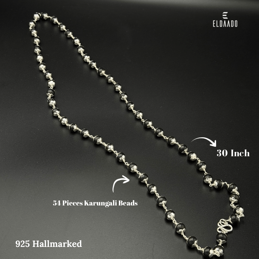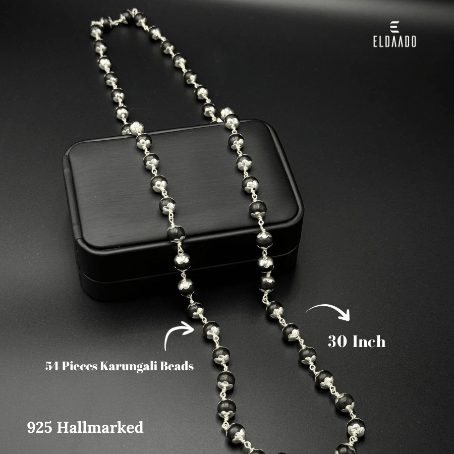 Discover elegance and tradition with this 30-inch Karungali beads chain made with 54 natural Karungali (Ebony wood) beads and pure 925 silver accents. Designed for wearing around the neck, this chain blends cultural value with a stylish look, making it perfect for both men and women.