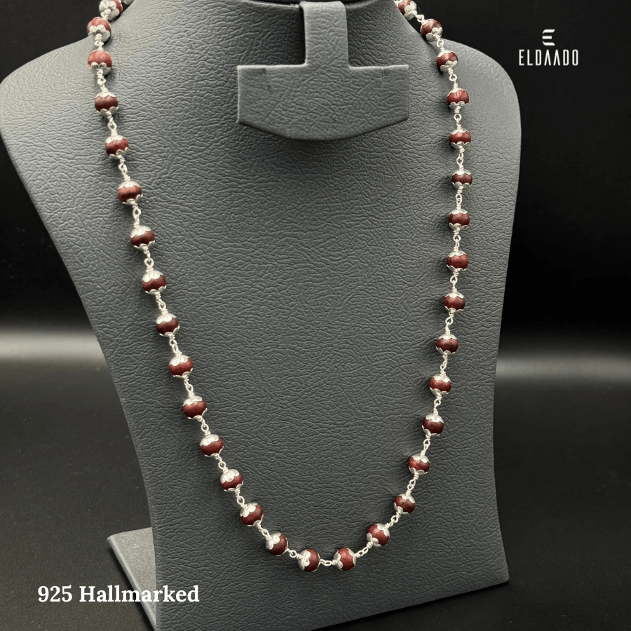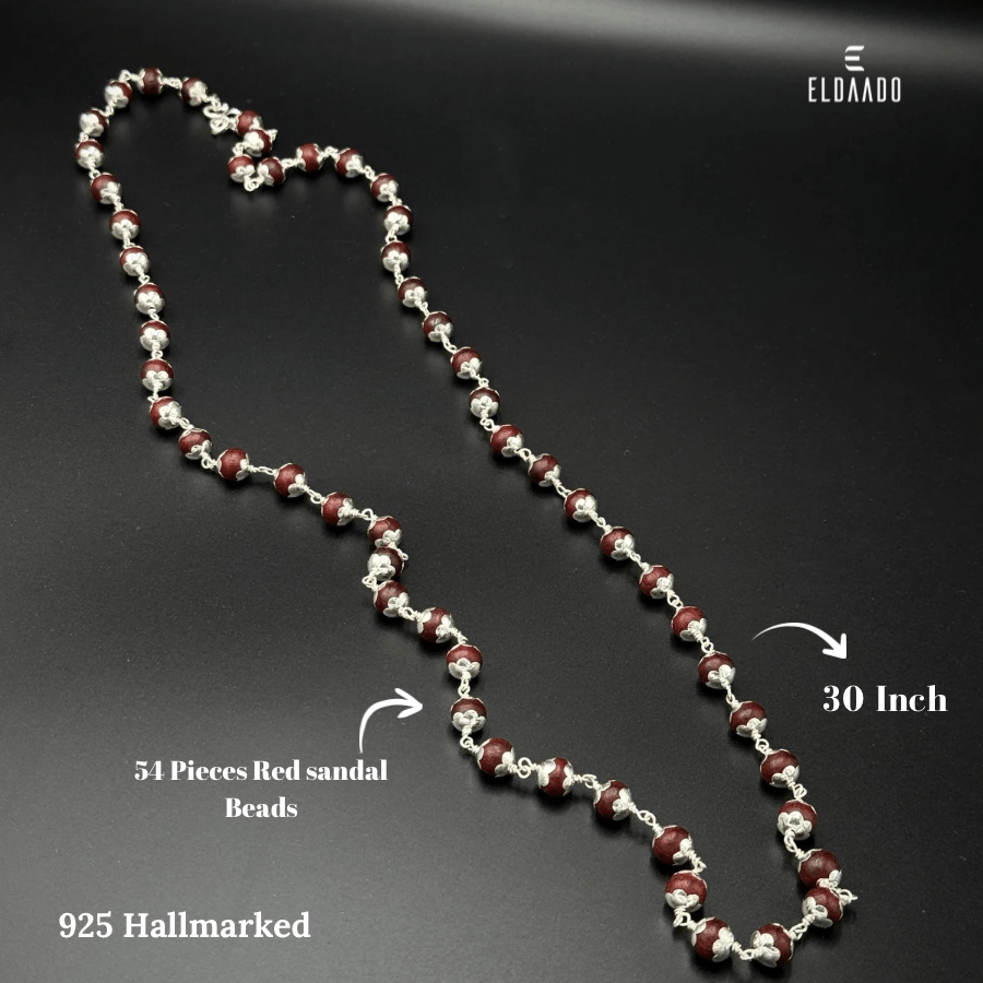 levate your spiritual style with this 30-inch Red Sandalwood beads chain, designed with 54 beads and pure 925 silver accents. Known as Raktha Chandan, Red Sandalwood holds cultural and spiritual value, believed to bring calmness, positivity, and good fortune.