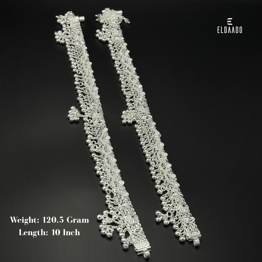 Add a regal touch to your style with this beautifully designed pure silver heavy anklet. Crafted with fine detailing and weighing 120.5 grams, this anklet is a perfect choice for weddings, festive occasions, and traditional celebrations. Its 10-inch length provides a comfortable fit while highlighting the grandeur of pure silver jewelry.