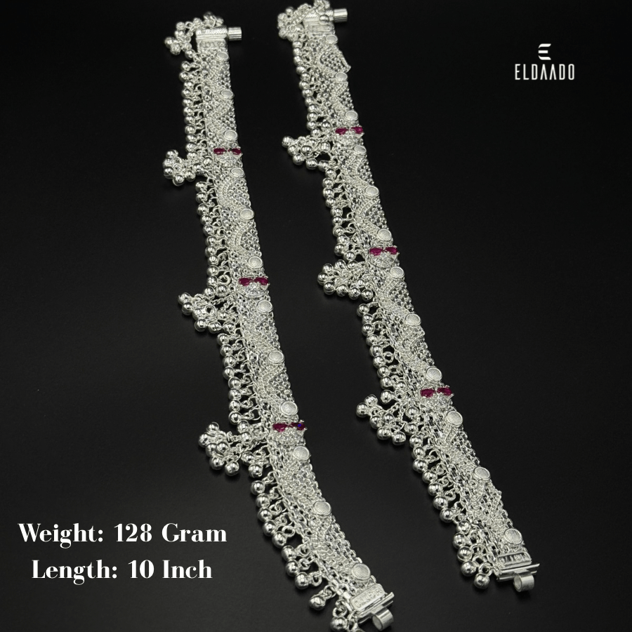 Add a regal touch to your style with this beautifully designed pure silver heavy anklet. Crafted with fine detailing and weighing 128 grams, this anklet is a perfect choice for weddings, festive occasions, and traditional celebrations. Its 10-inch length provides a comfortable fit while highlighting the grandeur of pure silver jewelry.