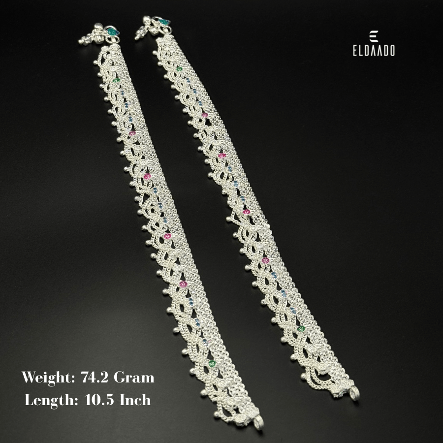 Crafted in pure silver, this heavy anklet is designed to bring elegance and charm to your traditional look. Weighing 74.2 grams, it strikes the perfect balance between beauty and durability. The 10.5-inch length ensures a comfortable fit, making it an ideal choice for weddings, festive occasions, and cultural celebrations