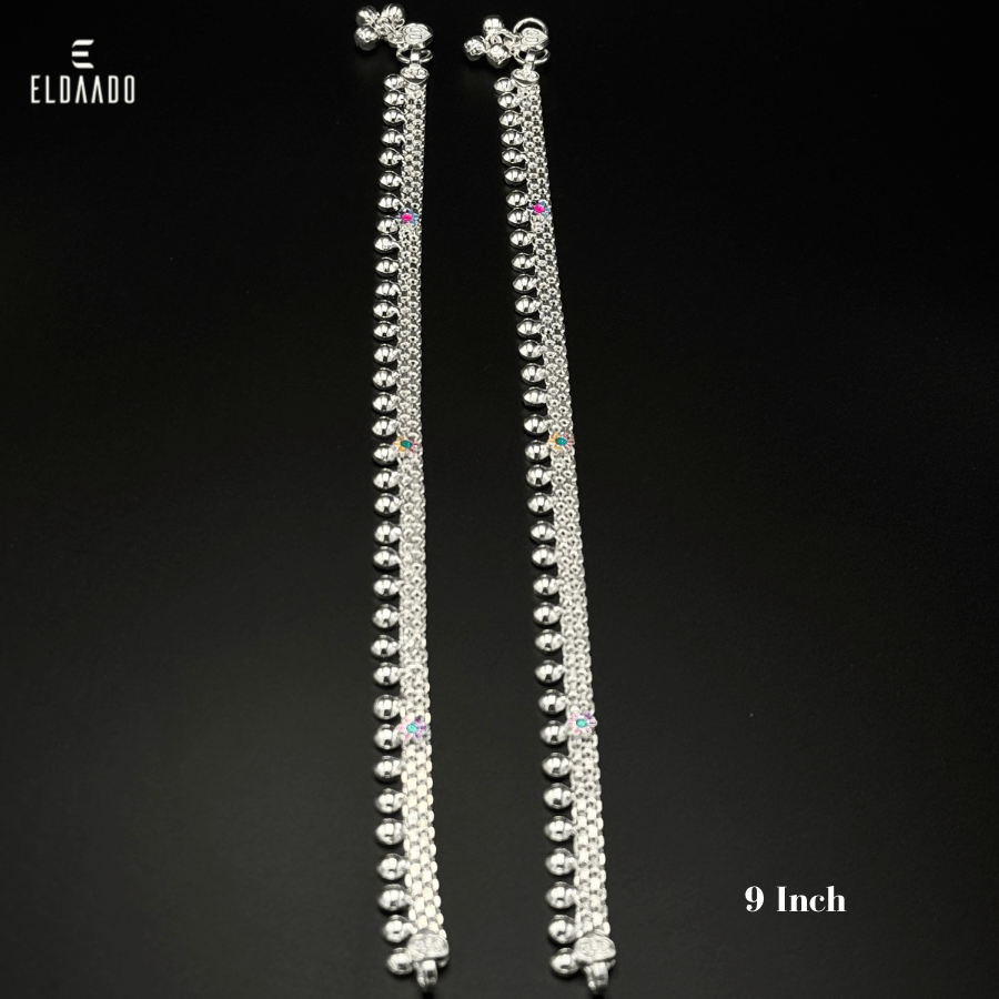 Adorn your feet with this elegant Pure Silver Anklet (Payal) for Women and Teenagers, crafted in a traditional payal style. Made with high-quality pure silver, it offers lasting shine and durability. With a weight of 36.7 grams and a 9-inch length, this anklet is perfectly sized for teenagers while also fitting adults comfortably. Ideal for daily wear, festive occasions, or weddings, it adds a graceful and stylish touch to any outfit.